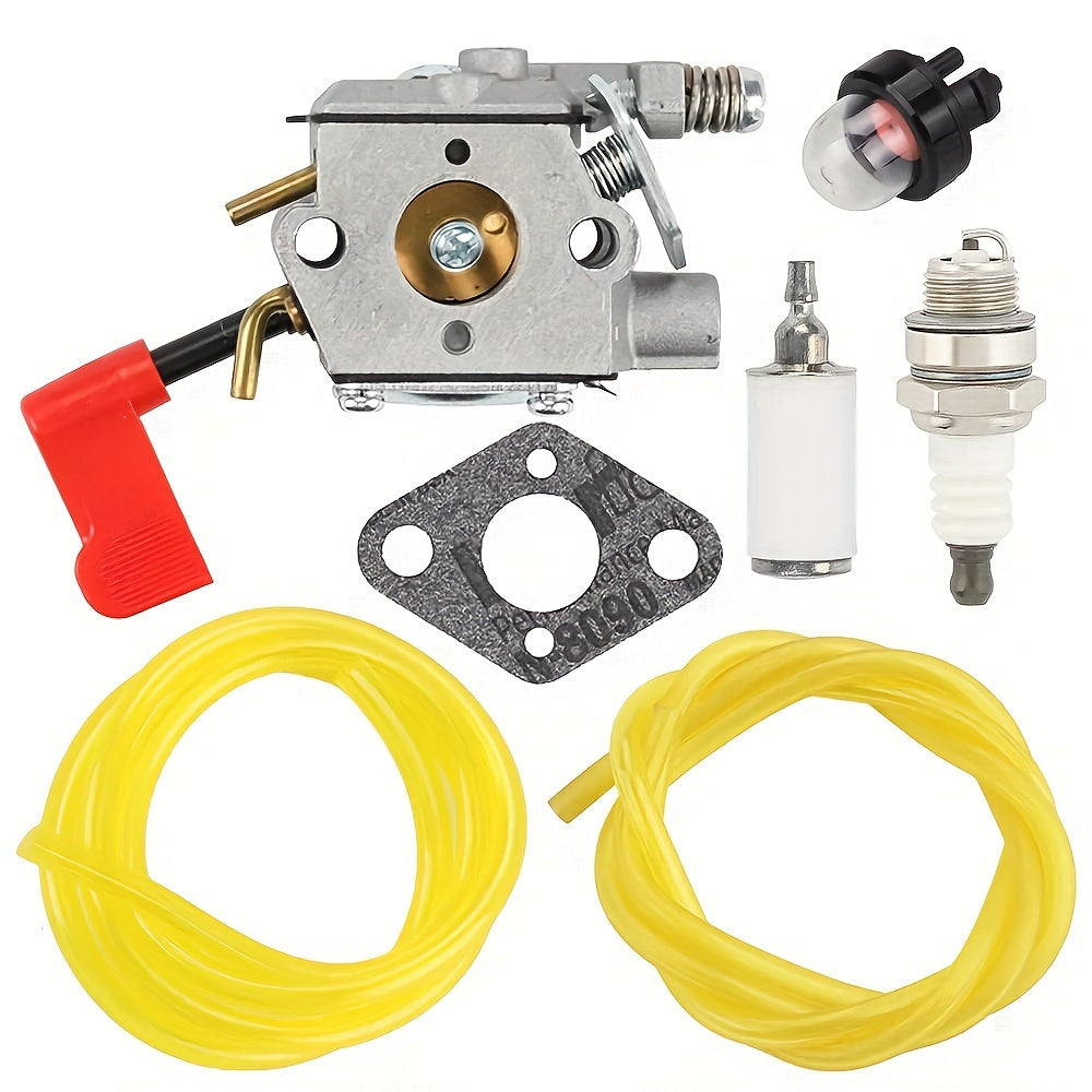 The package contains: 1x Carburetor, 1x Primer Pump, 1x Fuel Filter, 2x Fuel Lines, 1x Spark Plug, 1x Carburetor Gasket