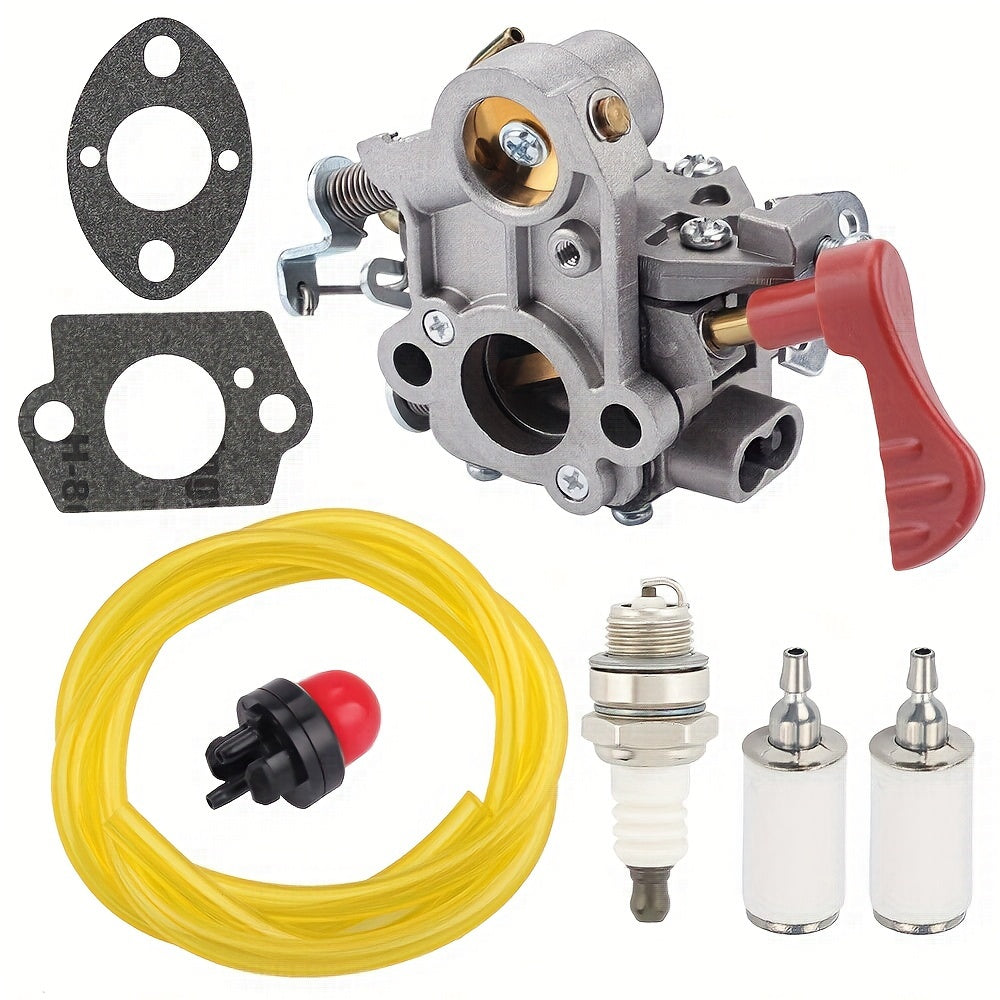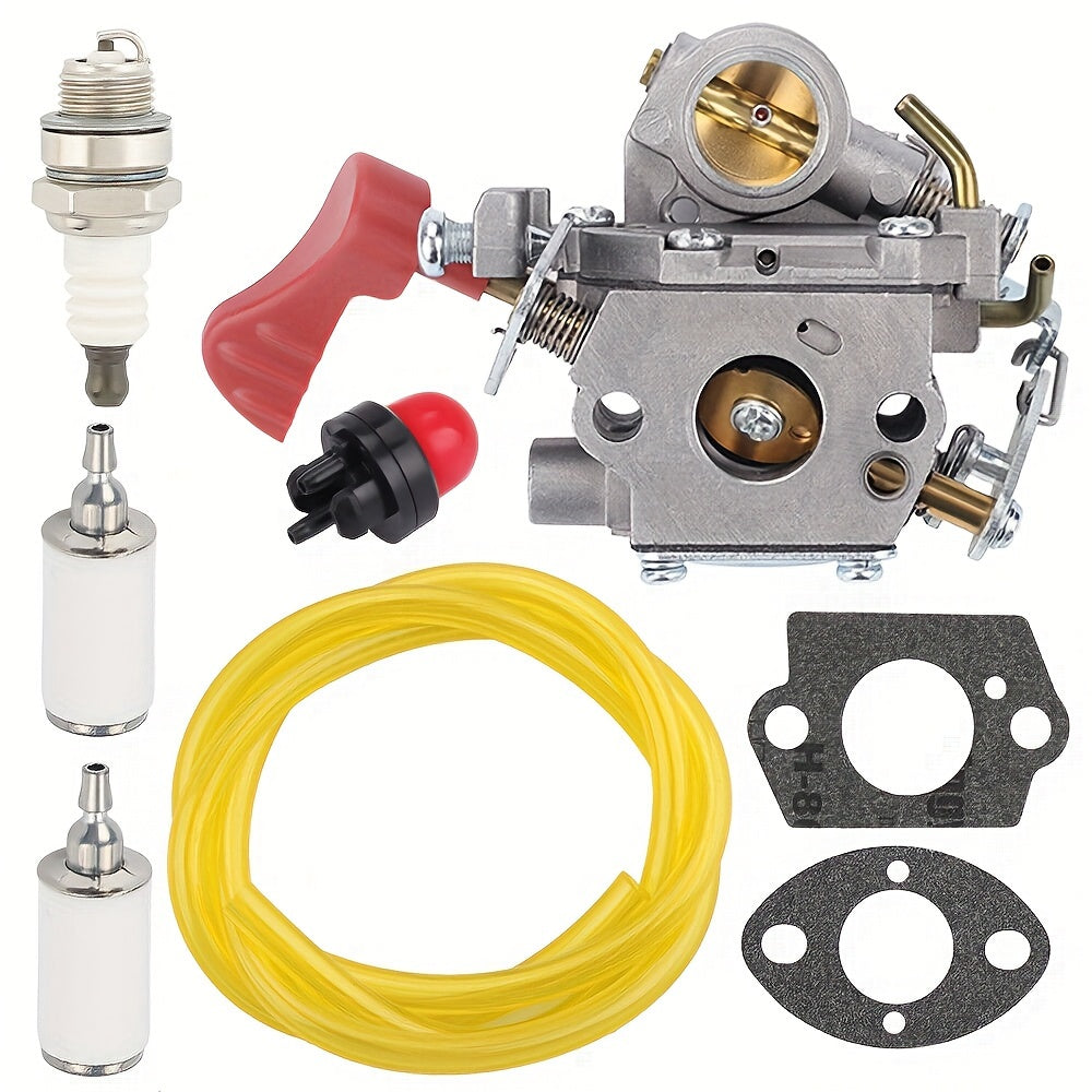 The set contains: 1 carburetor, 1 fuel line, 2 fuel filters, 1 spark plug, 1 primer bulb, 2 gaskets