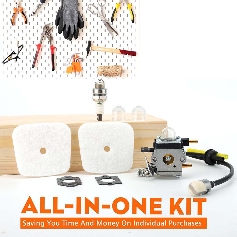 carburetor*1, mounting gasket*2, air filter*2, fuel line*3, grommet*1, vent*1, fuel filter*1, spark plug*1, primer bulb*2.