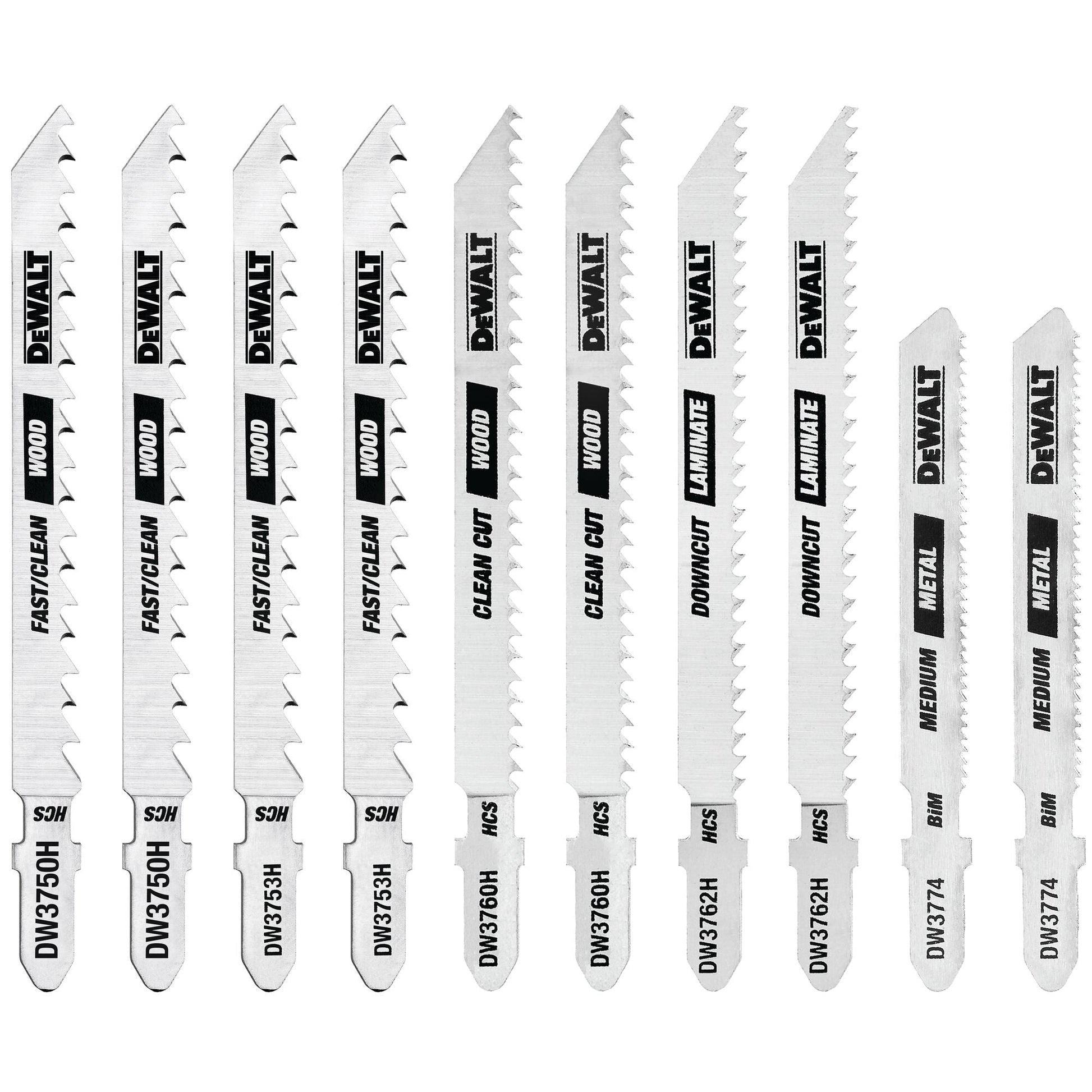 Packed with 3 different sets of blades with regular and fast-cut teeth, the DEWALT [Tool or Family Name] equips pros for a range of cutting applications. T-shank design fits all Bosch and DEWALT jig saws. Includes a durable, clear case.