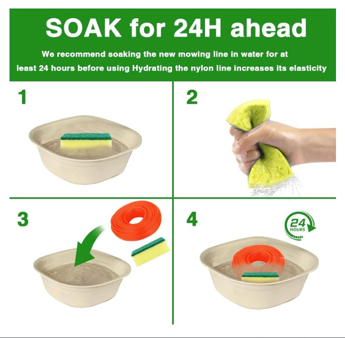 SOAK 24-HOUR Ahead to Increases Its Elasticity: We recommend soaking the new mowing line in water for at least 24 hours before loading it in your Grass Trimmer. Hydrating the nylon line increases its elasticity. You can keep the mowing line wrapped around the reel and place it directly into the water.