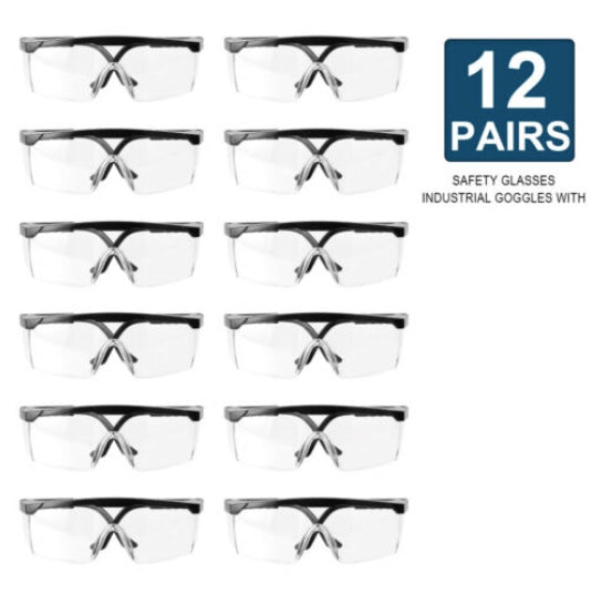 Hipa 12 Pack Anti Fog / Mist Universal Fit Safety Goggles Glasses Lens Eye Protective Concealer Clear Lab Outdoor & Indoor Work with Black Frame