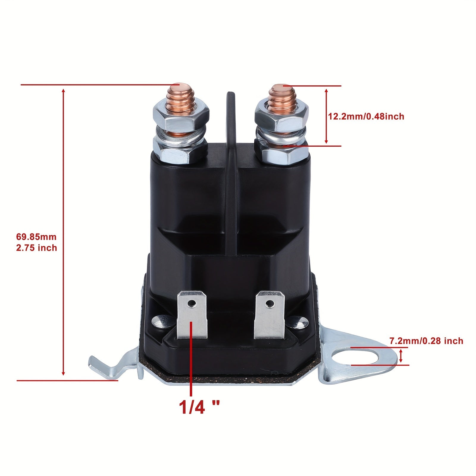 Specifications:12 Volt Solenoid, 12V 4-Termial, 1/4-20 Studs or 5/16-24 Studs, 1/4 Male Spade Terminal. Replacement starter solenoid for use on riding lawn tractors and Zero turn radius riding mowers.