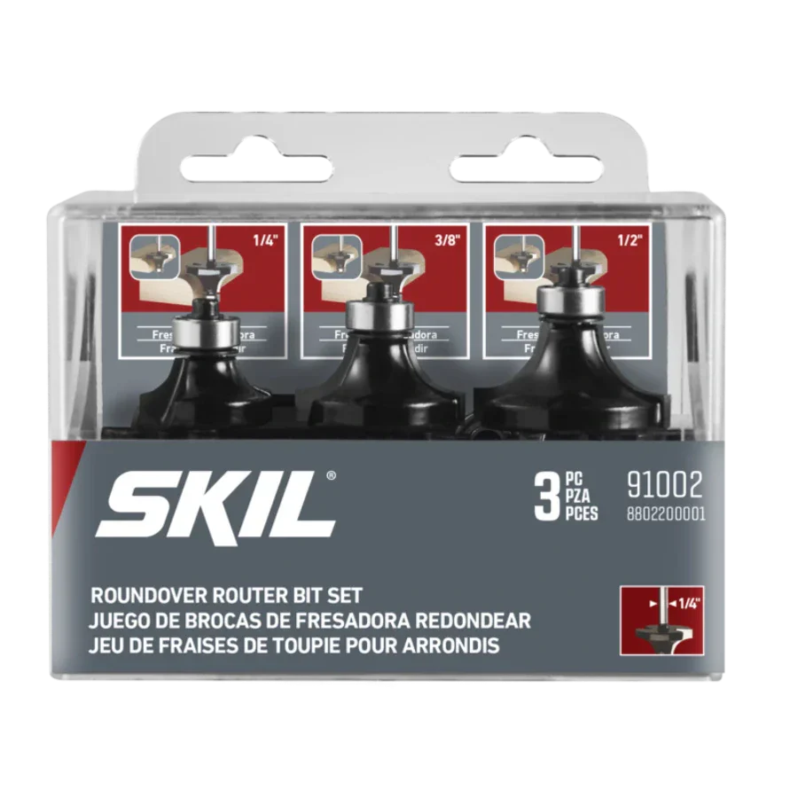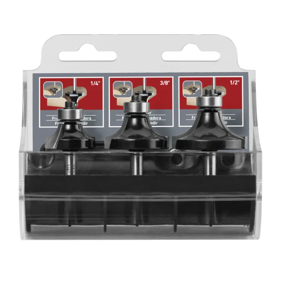 - Includes: (1) 1/4-inch, (1) 3/8-inch and (1) 1/2-inch roundover bits