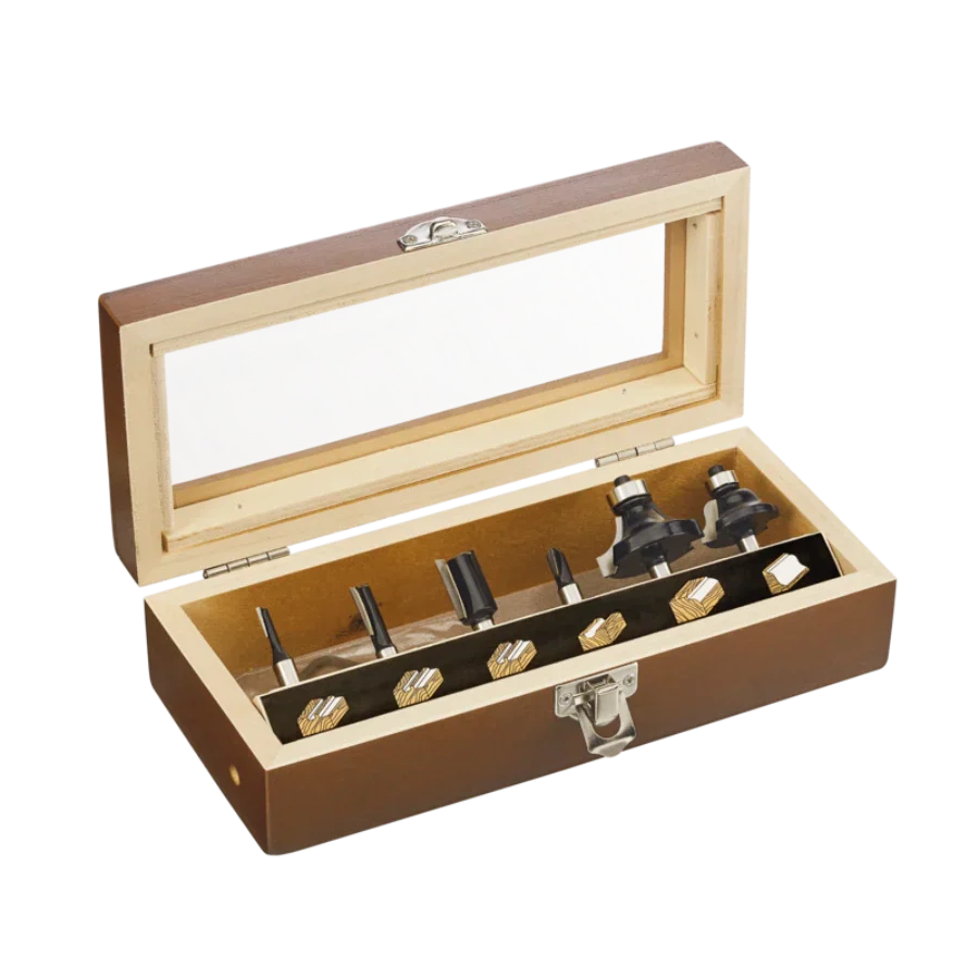 Set includes 3 straight bits, roundover bit, roman ogee bit, corebox bit and replacement bearing and hex key.