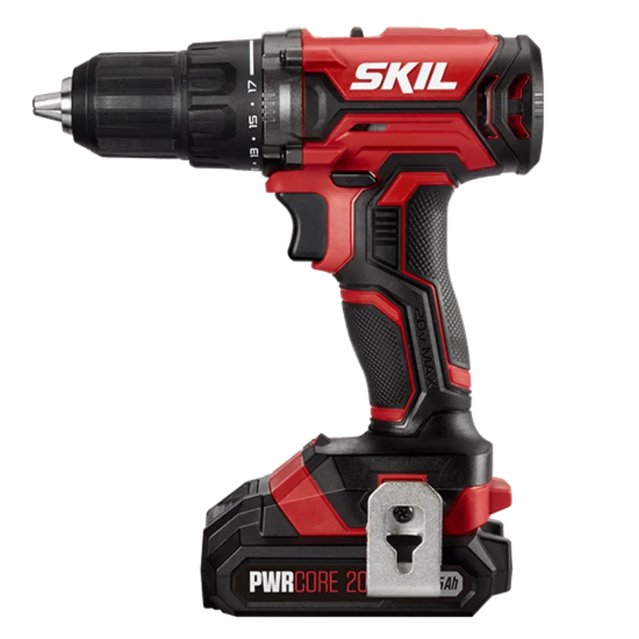 A Power Drill That Gets The Job Done. Tightening screws? Done. Assembling new furniture? Done. Drilling through wood, plastic or metal surfaces? Done, done and done. The SKIL 20V 1/2 Inch Cordless Drill Driver is the power drill you want for any home project. This power drill comes with a PWRCORE 20™ 2.0Ah Lithium Battery and 20V Charger.