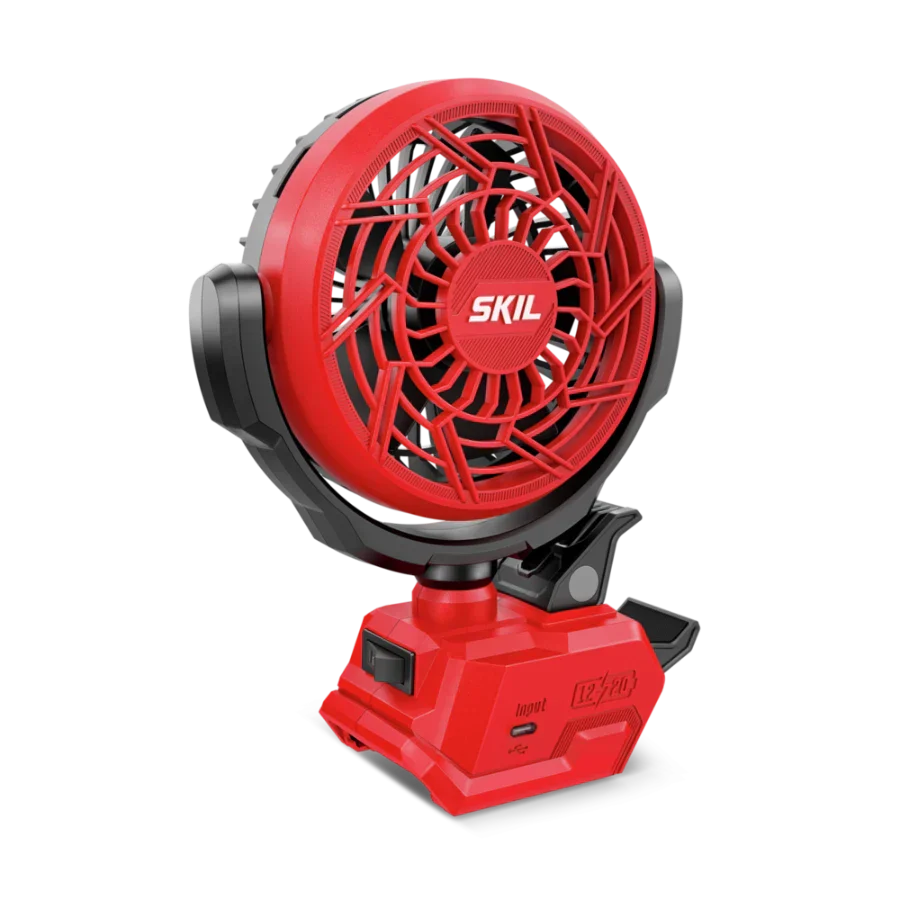 The SKIL MULTIVOLT Brushless 4 In. Clamp Fan uses SKIL multivolt technology to be powered by either PWRCORE 12™ or PWRCORE 20™ batteries. It also offers a hybrid AC option to be powered via USB-C. This convenient, compact clamp fan delivers powerful airflow up to 200 CFM with airspeeds up to 11 MPH. Its industrial threaded clamp provides strong holding capacity. This cordless fan is built for tight spaces or easy on-the-go use, and its multidirectional pivoting and swiveling head can send air where you need it. It runs up to 14 hours on low when powered by a PWRCORE 20™ 2.0Ah 20-volt battery or up to 8.5 hours on low with a PWRCORE 12™ 2.0Ah 12-volt battery (batteries sold separately).