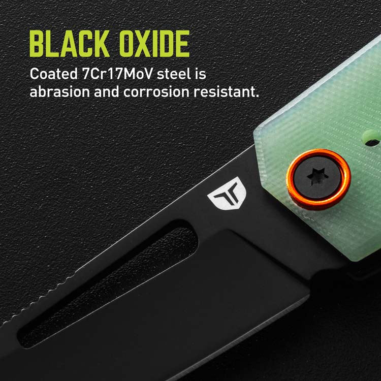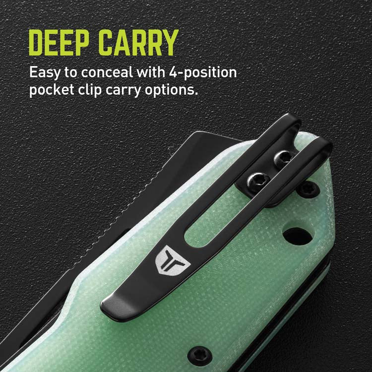 Crafted for those who dare to stand out, the BERM® Cleaver is more than just a knife; it's a statement piece. Its striking cleaver blade, paired with jade- colored natural G10 scales, will be sure to capture attention and praise. This mid-size addition to the BERM family of knives is engineered with our Fast Flip caged ball bearing pivot system, ensuring swift deployment. The 2.5-inch cleaver blade stands ready for any slicing or chopping challenge, delivering sharp cutting performance with style. The 4-way, deep carry pocket clip offers versatile carry options, catering to both right-handed and left-handed users, whether you prefer tip-up or tip-down orientation. The G10 handle scales retain the modern and ergonomic styling of the other knives in the family while providing just the right amount of texture for secure handling. Enhanced with a black oxide coating, the blade offers exceptional abrasion and corrosion resistance, ensuring it maintains its refined form year after year.